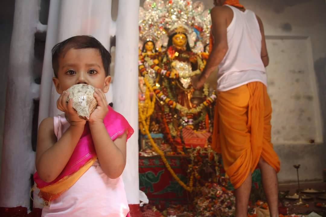 There are many families run Durga Pujas which are unique in their own ways. One may miss the pomp and the grandeur of the big budget pujas but that is replaced by the ethnicity and traditional ways of performing the Puja, the entire family coming together with distributed responsibilities to perform the Puja and most of these Pujas have a great history behind. Subhajit Chakraborty found a moment like this and grabbed it. In his words-