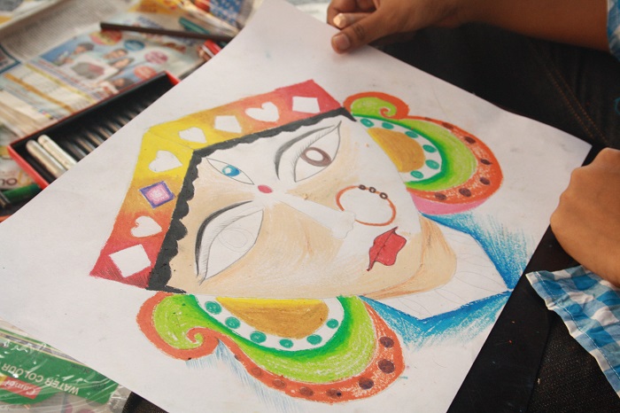 While the festival is for 5 days, but like the artisans and idol makers who have been preparing for the Puja for a long period of time, the preparations start somewhere else also. Almost everyone in West Benga,l at some point of time or other have participated in some form of Durga Puja cultural activity. Durga Puja is also the time to embrace the stage for the first time for many and then for some, it becomes an annual affair. For Sushmita, her fondest memories are around the cultural competition around Durga Puja. In her words “As a Delhi Bengali, some of my fondest memories of Durga Puja are of the various cultural activities we took part as kids and youngsters during the 5 days of the festival. The Bengali community of Delhi comes together these 5 days in different parts of the city and not only prays together but plays, dances and sings together. One of the most important and fun activities that almost every locality Durga Puja organizers is the ‘Painting & Art’ Competition for kids. As a child, it used to be a matter of pride to win these competitions. l clicked this photo one year when I was organizing a painting competition at my locality Pujo. A kid was completely immersed in drawing this beautiful image of Maa Durga and I felt I should click an unfinished portrait rather than a finished one.”