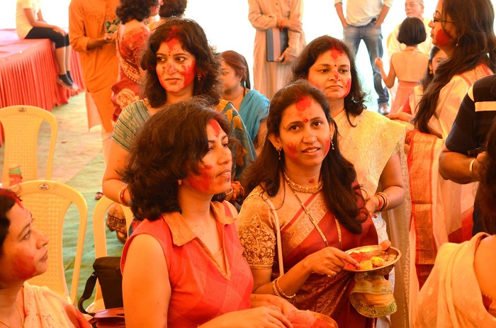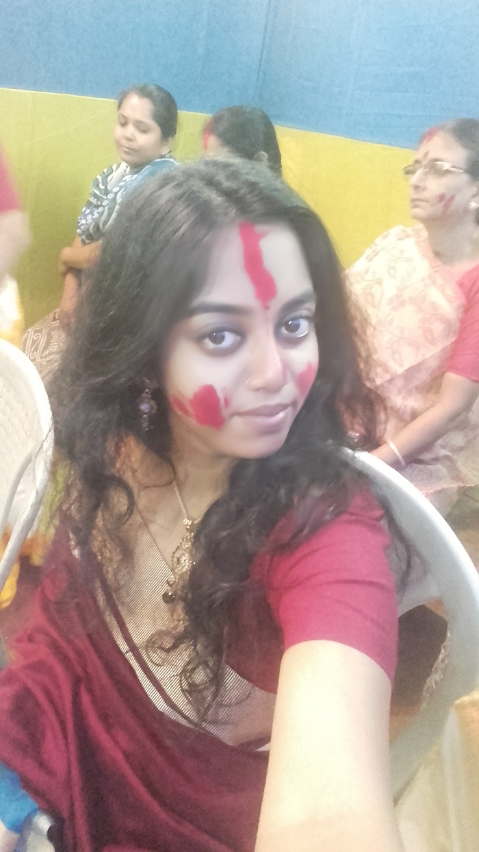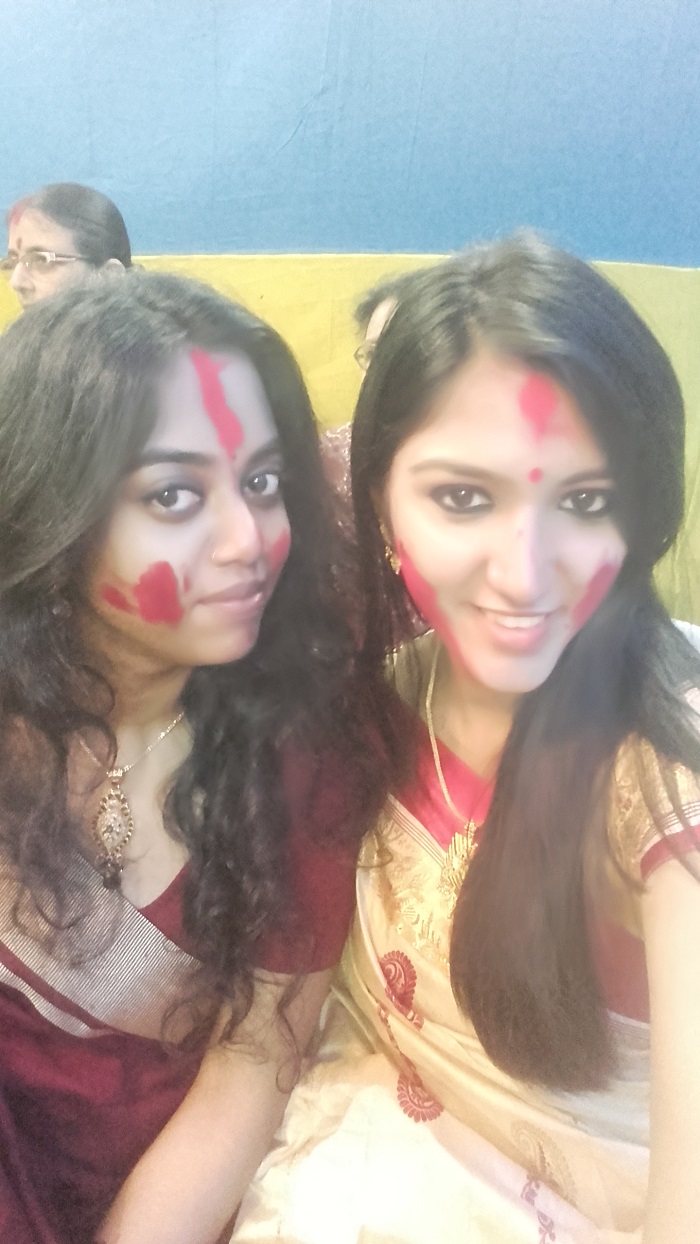 – “Dashami. The last day. The day of complete bliss with a tinge of sadness. A day when we already start thinking about next year’s Durga Puja because it’s all about ‘asche bachor abar habe’. It’s the day for “Sindoor Khela”, though for married women, my friend (Susmita) and I, always jump into the play. As, for me, it is a feeling which is difficult to describe, but where I have always wanted to be a part of, and of course, whenever I think about it, it always gives me that “bari” feeling and yes, the “puja” feeling too, because staying away from Kolkata this memory takes me back to my good old’ Calcutta!”