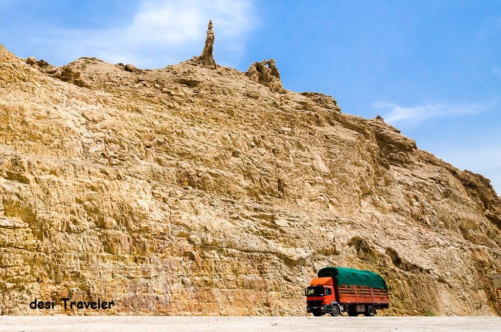 As Lot and family were fleeing the city of Sodom, they were instructed by the angels to not look back, but Lot’s wife did look back and was immediately converted in a pillar of Salt. Now our today’s travel Tuesday picture is of that Pillar of Salt believed to be originally Lot’s Wife ( she is not referred by her name in Holy Bible, only some Jewish references mention her as Ado or Edith ). This Salt Pillar is on a small hill opposite the Jordanian side of Dead Sea. We stopped there on our way to the Dead Sea. As the landscape was very barren with not even a blade of grass visible, so I waited for this truck to pass below to add some contrast and color to the picture. This also gives some idea of scale to the height of the hill and the pillar. I was standing on the other side of the road next to the Dead Sea Bank when I clicked this picture during my visit to Jordan
