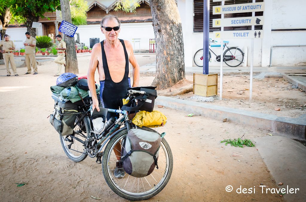 First about the French cyclist. I met him more than a year ago briefly at the palace gates and was surprised to see his cycle loaded with all kinds of bags and camping gear.