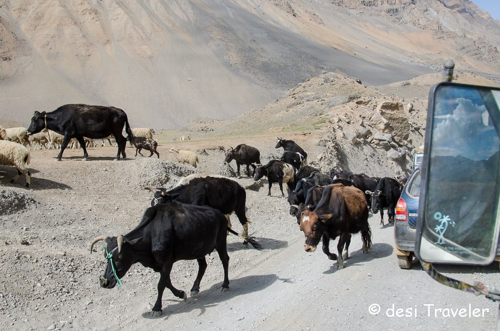 So like I said Rohtang is not very photogenic what with 100s of vehicles in the traffic jam and 1000s of tourists trying to take their selfies. But the moment you cross Rohtang not only the scenery but also the gentry changes. No longer you have hundreds of honking Mrootis and Indicas and Innovas, suddenly the road is empty and goes to unroad and your #untravel begins. You encounter some mules now and then and herds of cattle, goats, and sheep, who are clearly never happy to see you.